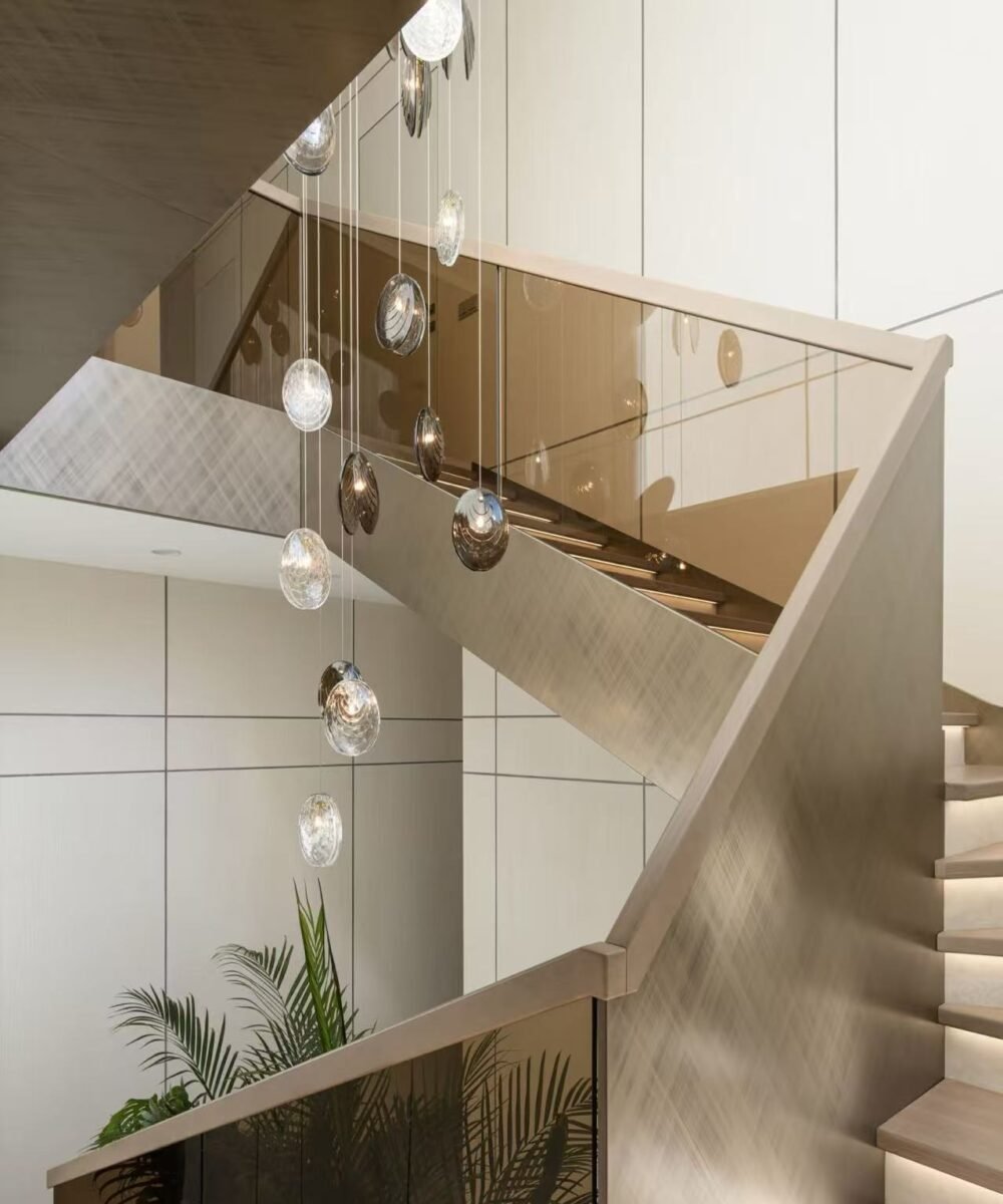 This chandelier features multiple translucent elliptical spheres, hanging in a staggered manner in the stairwell, as dynamic as an art installation. The spheres with metal and glass textures reflect layered light and shadow, infusing modern artistic charm into the stair spaces of duplex residences and high-end clubs. It is not only a lighting fixture but also a focal point of spatial aesthetics, instantly enhancing the space’s style and artistic atmosphere.
